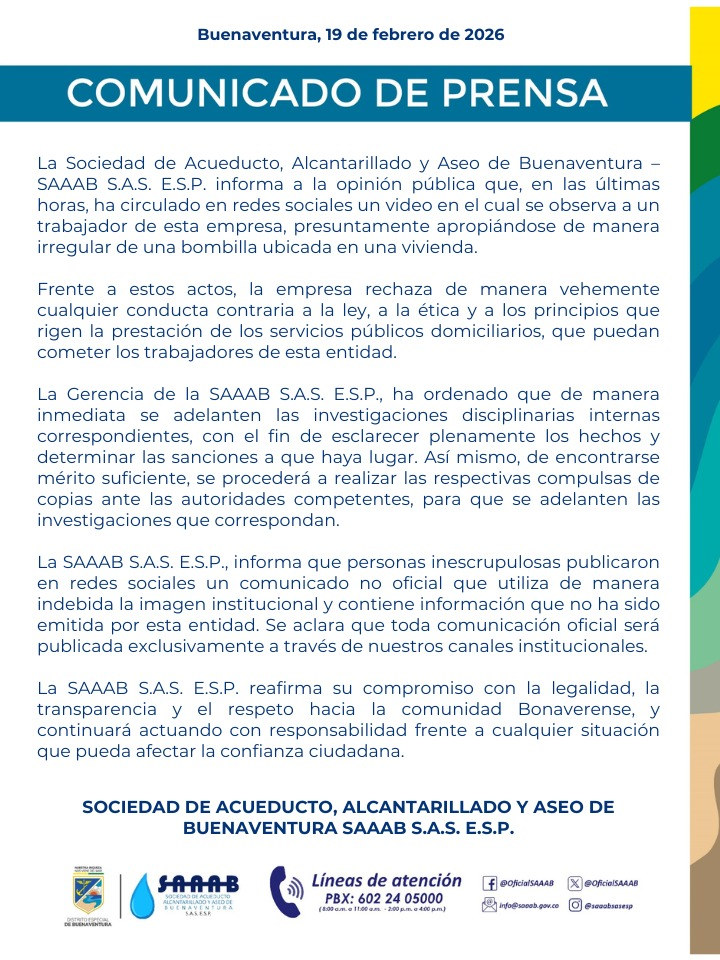 La SAAAB S.A.S. informa a los medios de comunicación y a la ciudadanía que, frente al video que circula en redes sociales en las últimas horas, la empresa emitió un comunicado oficial en el cual se detallan las acciones institucionales adoptadas y el inicio de las verificaciones internas correspondientes.